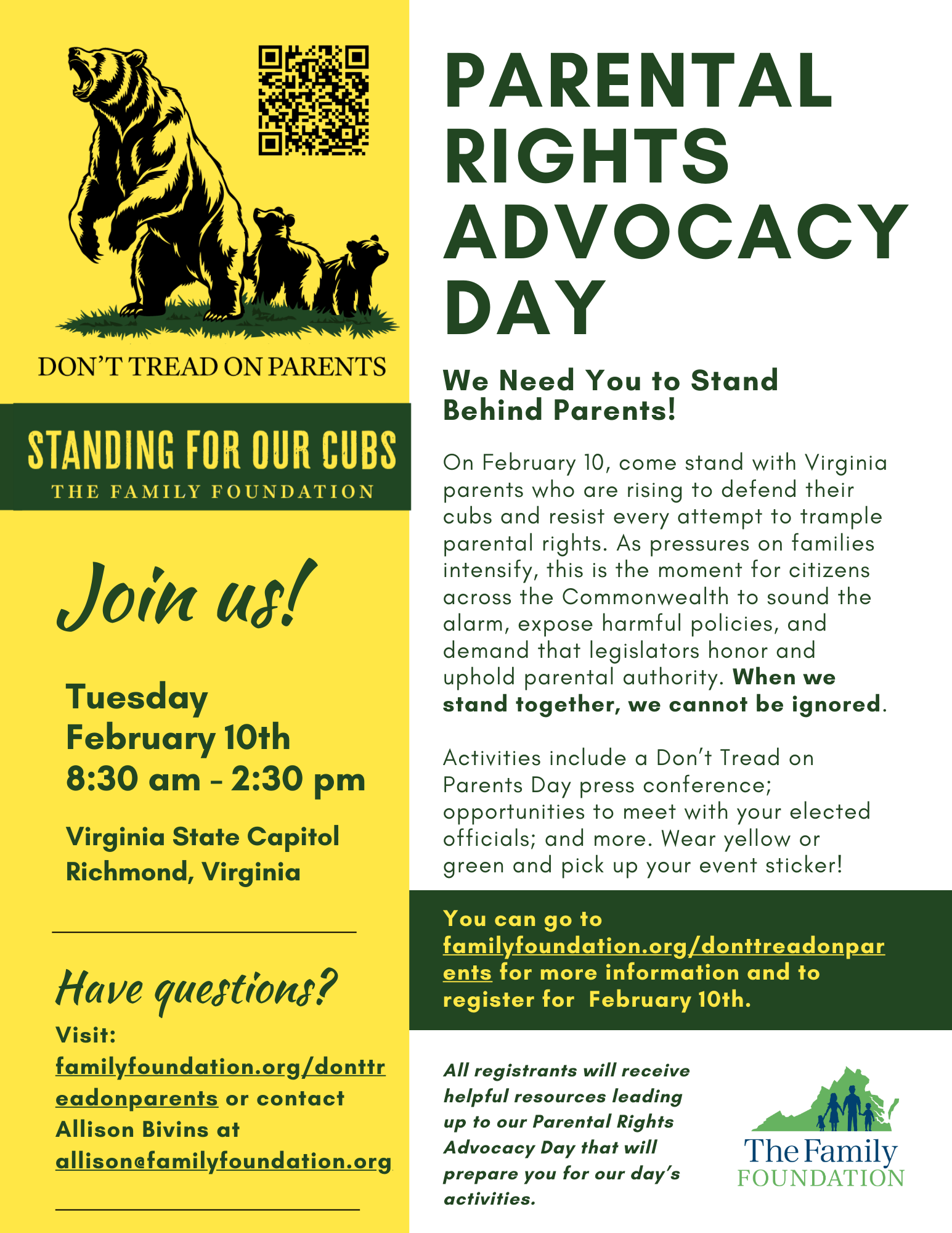 In this moment, Virginia needs families—and those who support them—to come stand behind courageous parents who are standing up for their cubs. Government intrusion is growing, and the threats to parental rights are real. That is why Virginia families are drawing a firm, unmistakable line: