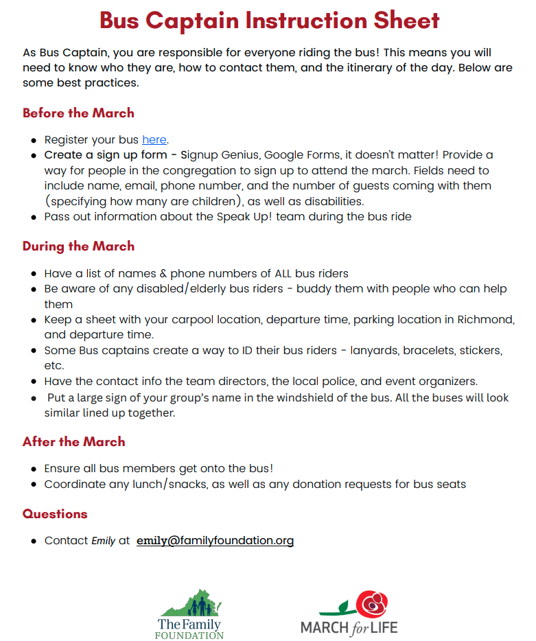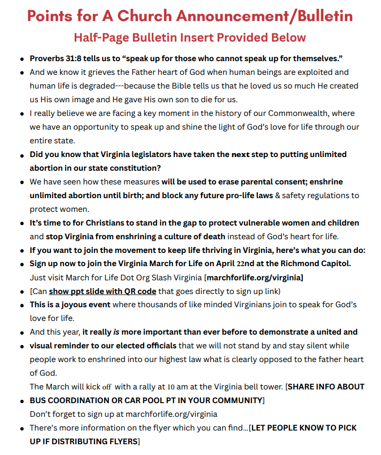 Virginia March For Life Downloadable Pastor Resources Click images to access downloadable PDFs. Printable Flyer PowerPoint Slide MFL Promo Videos Points for A Church Announcement/Bulletin Bus Registration Instructions