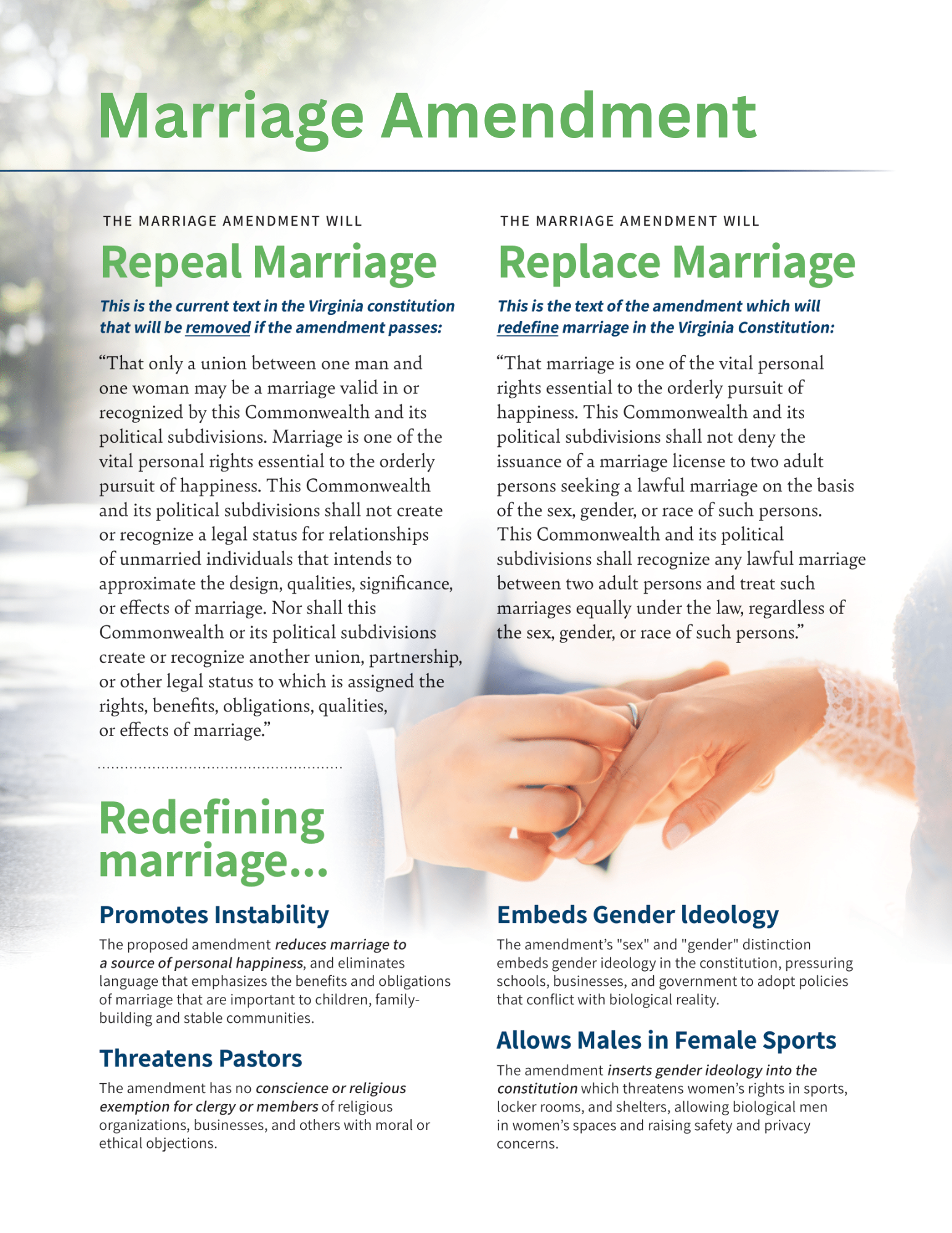 If passed, the repeal-and-replace marriage amendment would enshrine gender ideology into our state constitution, threatening girls' safety and sports, as well as basic religious liberties.